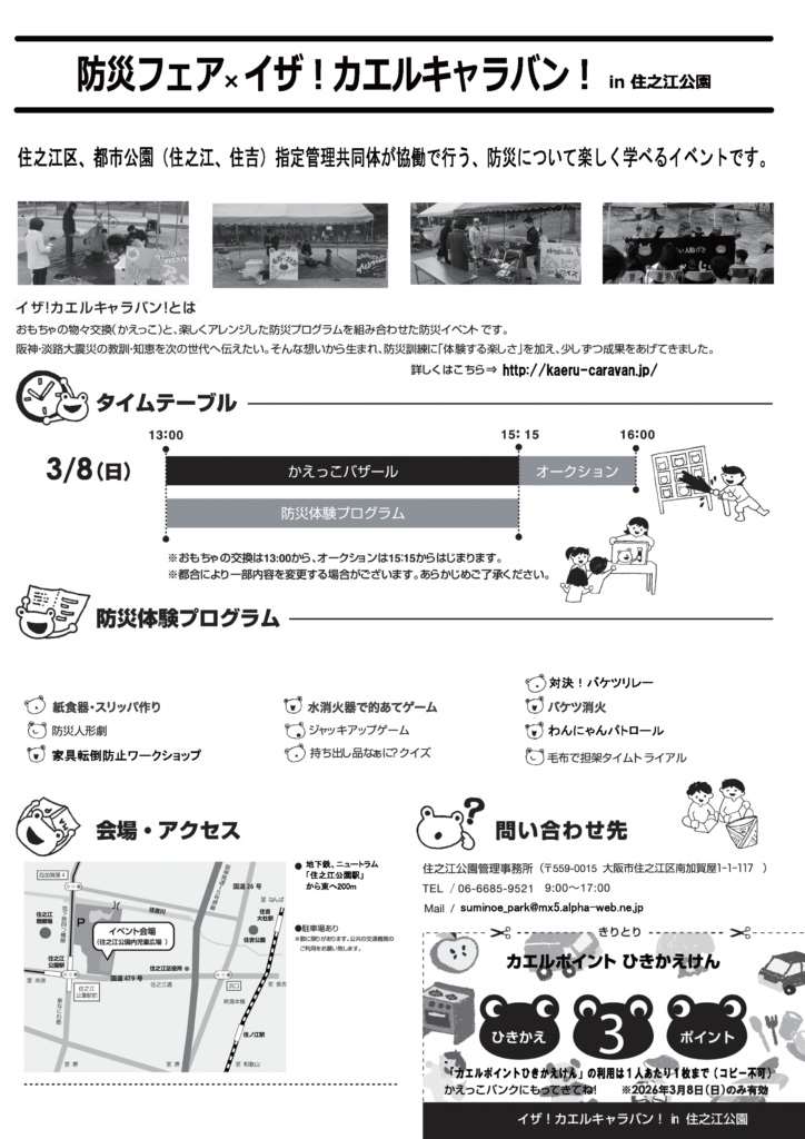 2026年 3月8日(日) に、住之江公園内児童広場にて「防災フェア×イザ!カエルキャラバン! in 住之江公園」が開催されます。